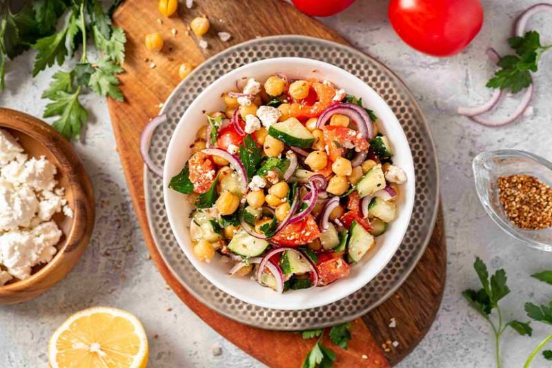 Mittagessen: Gönn Dir zum Mittag einen Kichererbsensalat mit Feta. Mit 403 Kalorien pro Portion ist er ebenfalls ideal zum Abnehmen mit Ernährungsplan geeignet.
