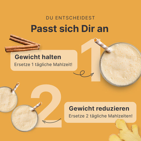 Das Ersetzen von zwei der täglichen Hauptmahlzeiten durch je einen SHEKO Shake trägt zur Gewichtsabnahme im Rahmen einer kalorienarmen Ernährung bei. Das Ersetzen einer täglichen Mahlzeit hilft Dir, Dein Gewicht zu halten.