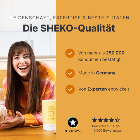 Der SHEKO Shake erfüllt den gewichtskontrollierenden Zweck nur im Rahmen einer kalorienarmen, abwechslungsreichen und ausgewogen Ernährung. Dafür ist es wichtig, dass Du auch andere Lebensmittel zu Dir nimmst, sowie die Angaben zur Zubereitung einhältst. Achte dabei auf eine gesunde Lebensweise und, dass Du täglich genügend Wasser oder ungesüßten Tee zu Dir nimmst.