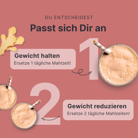 Das Ersetzen von zwei der täglichen Hauptmahlzeiten durch je einen SHEKO Shake trägt zur Gewichtsabnahme im Rahmen einer kalorienarmen Ernährung bei. Das Ersetzen einer täglichen Mahlzeit hilft Dir, Dein Gewicht zu halten.