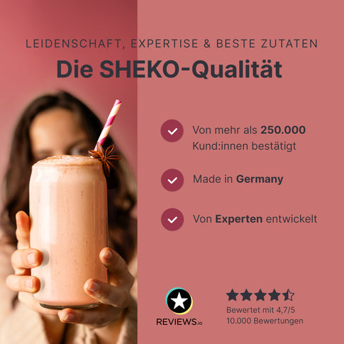 Der SHEKO Shake erfüllt den gewichtskontrollierenden Zweck nur im Rahmen einer kalorienarmen, abwechslungsreichen und ausgewogen Ernährung. Dafür ist es wichtig, dass Du auch andere Lebensmittel zu Dir nimmst, sowie die Angaben zur Zubereitung einhältst. Achte dabei auf eine gesunde Lebensweise und, dass Du täglich genügend Wasser oder ungesüßten Tee zu Dir nimmst.