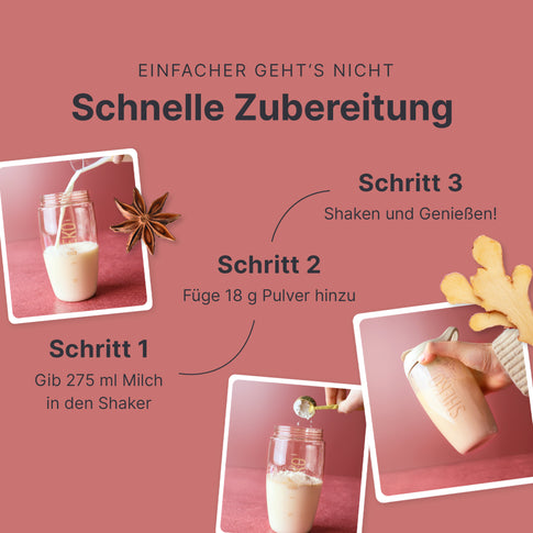 Dein Shake ist in nur drei Schritten fertig: Gib 275 ml Milch (1,5 % Fett) in den Shaker. Füge 18 g Pulver (ca. 2 gehäufte EL oder 2 gestrichene Messlöffel) hinzu. Schüttle alles gut durch. Fertig zum Genießen!