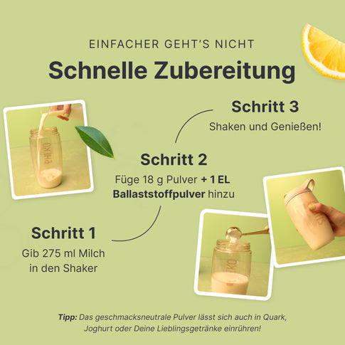 Du kannst ganz einfach 1 Eslöffel (10 g Pulver) täglich in Deinen Balance Shake einrühren. Das Pulver ist geschmacksneutral, löst sich gut auf und bereichert Deinen Shake mit wertvollen Ballaststoffen, die Deine Verdauung unterstützen. Alternativ kannst Du es natürlich auch in alternative Getränke oder auch Joghurt einrühren.