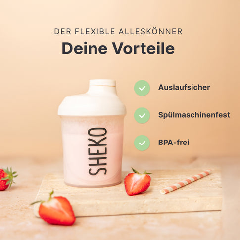 Mit einer Füllkapazität von bis zu 400 ml ist er perfekt für Deinen SHEKO-Shake. Neben 275 ml Milch und 18 g Pulver ist so noch genügend Platz, um ordentlich zu shaken! Klein, süß und handlich wie er ist, passt er perfekt in jede Tasche!